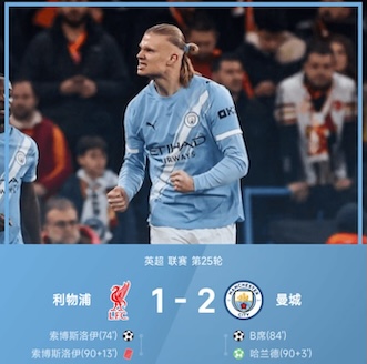 上半场哈兰德失单刀,红军零射正,下半场埃基蒂克失良机,索博任意球世界波+补时染红,B席扳平,哈兰德传射+点球绝杀。最终曼城客场2-1逆转双杀利物浦。