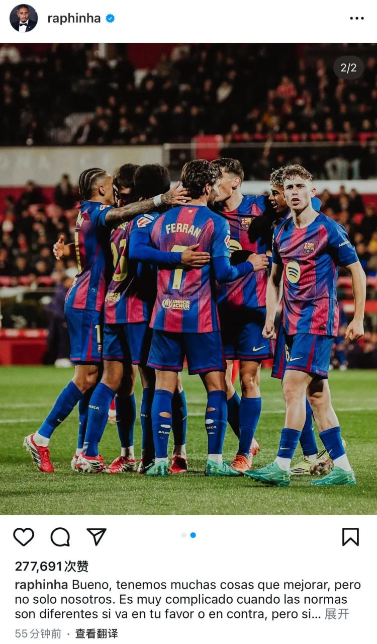 赛后,拉菲尼亚更新了Instagram:好吧,我门有很多地方需要改进。但不仅仅是我们,当规则因人而异,情况会变得非常复杂,无论是对你有利还是不利。但如果我们必须对抗全部人才能获胜,那也没关系,我们会做到的。巴萨万岁,永远如此。