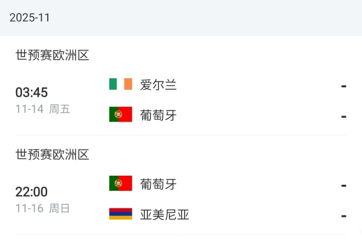 葡萄牙公布11月世预赛名单,目前葡萄牙3胜1平在世预赛欧洲区F组排名第1,领先第二名的匈牙利5分。C罗领衔此次名单,B费、莱奥、菲利克斯、若昂·内维斯等人悉数入选,努诺·门德斯因伤缺席。